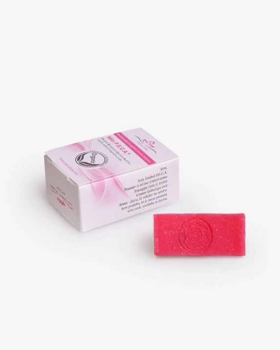 Sestava: milo z vtisnjenim simbolom P.E.C.A. je energijsko oplemeniteno in ročno izdelano iz rastlinskih maščob (palmina, kokosova, sojina, olivna, sončnična, ricinusova in olje grozdnih pešk), obogateno z eteričnima oljema rožnega lasa in burbonske geranije ter suhimi cvetovi vrtnice. Izdelano po hladnem postopku, ki v milu ohranja naravni glicerin. Le ta deluje dodatno vlažilno in negovalno na kožo. Koža je po uporabi bolj mehka in prožna. Ne vsebuje živalskih in industrijskih maščob.