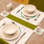 Dimenzija: v kompletu sta dva pogrinjka za hrano – dimenzije 43 x 30 cm, in dva podstavka za pijačo – dimenzije 10 x 10 cm.